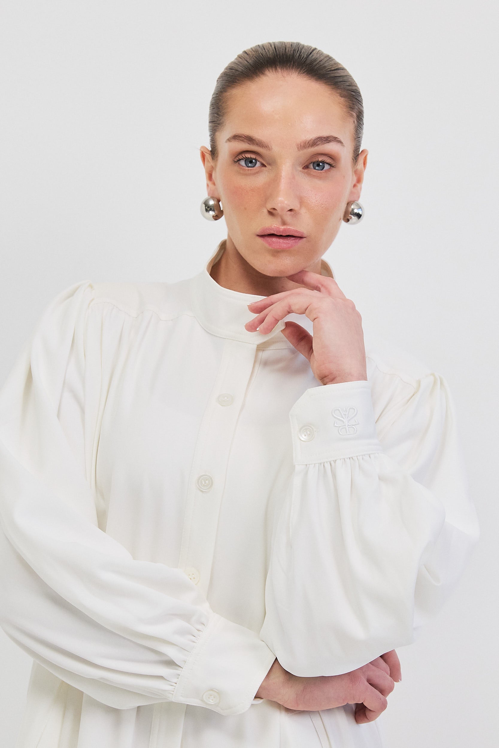 שרוולים עם כיווצים בסיומת חפת עם רקמת לוגו .