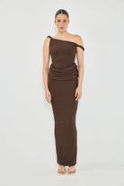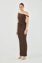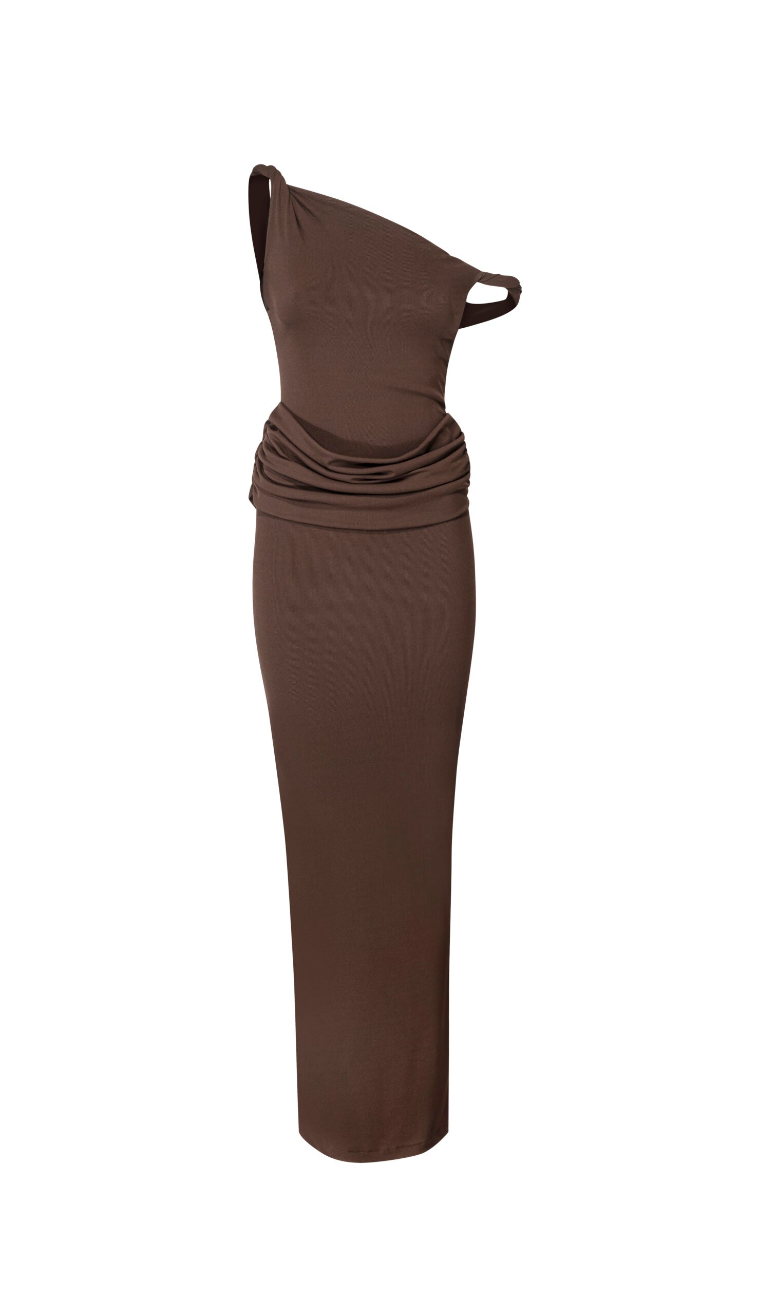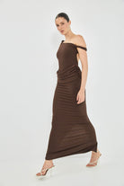 כיווצים לאורך השמלה עם כתפייה נופלת וחגורת כפלים במותן .
